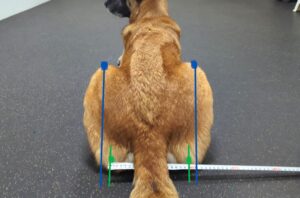 Sėdėjimo platformos plotis apskaičiuojamas išmatavus atstumą tarp šuns kulnų ir kelių gulimoje pozicijoje ir išvedus tarp jų vidurkį + 10 proc. Pažiūrėkime į pavyzdį nuotraukoje: atstumas tarp kulnų 20 cm, atstumas tarp kelių – 26 cm, tai platformos plotis 23cm + 10proc = 25cm.